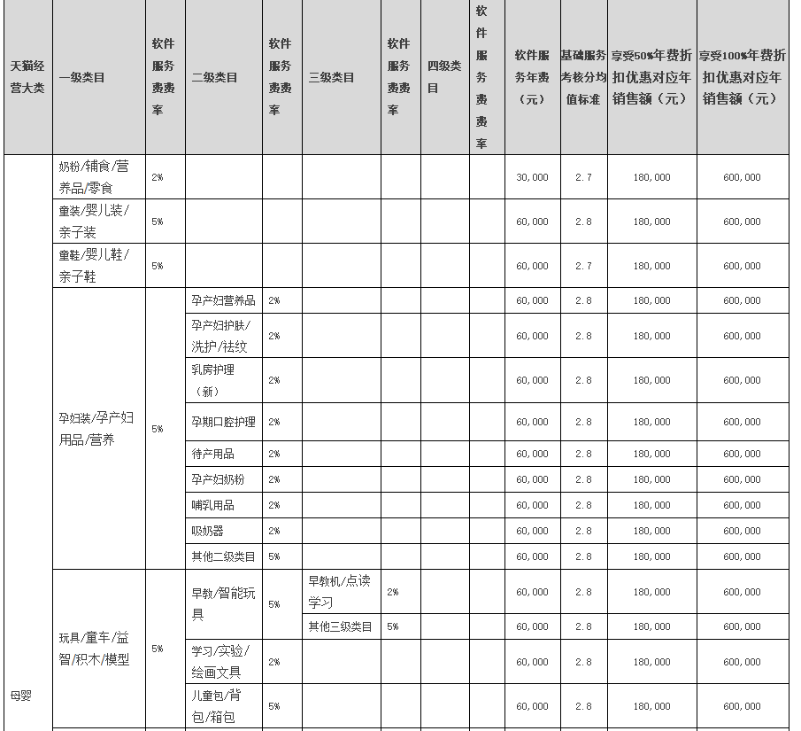 2、由于类目划分较细,二级类目、三级类目仅列出与一级类目扣点或固定年费不同的类目,各一级类目下完整的二级类目、三级类目列表以商品发布页面为准。