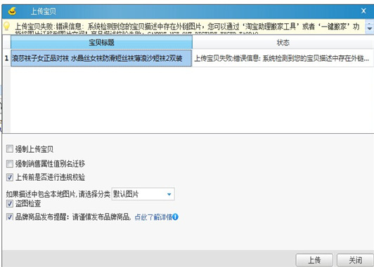 当上述情况的宝贝上传时或修改时会提示:上传宝贝失败错误信息: 系统检测到您的宝贝描述中存在外链图片,您可以通过‘淘宝助理搬家工具’或者‘一键搬家’功能将图片迁移到图片空间!商品描述校验失败:CANNOT_USE_OUT_PICTURE_EXCEP_TAOBAO(如图)
