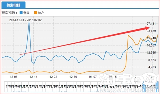 接手的时间是在12月初,通过数据分析,坚果及特产在每年的一月以后搜索指数处于增长高峰期,从时间节点上来看,主营产品还是有一定优势的。