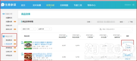 借助生意参谋中的商品效果,通过商品温度计和单品分析各个宝贝情况,不断地优化宝贝各方面的指标情况。也可结合生e经的宝贝分析功能,对确定的引流款及其他利润款进行详细的诊断分析。结合各项指标分析,对其进行SEO优化、关联搭配,结合行业参考的热销单品进行差异化对比。当然这是一个长期的不断优化的过程,效果虽不是立竿见影,但坚持总会有所成效。