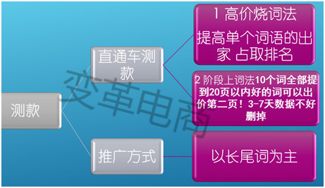 我们在前面讲到选款,款式确定了之后我们需要做的就是直通车的测试啦!,这里讲了2个步骤和方法! 第一就是高价烧词法 提高单个关键词的排名出家占取排名 测试展现以及点击率! 第二就是阶段上词法10个关键词全部提到20页以内好的词可以出价到第二页 以5000以及以上的展现为标准 数据表现不佳的全部删掉 重新上词!
