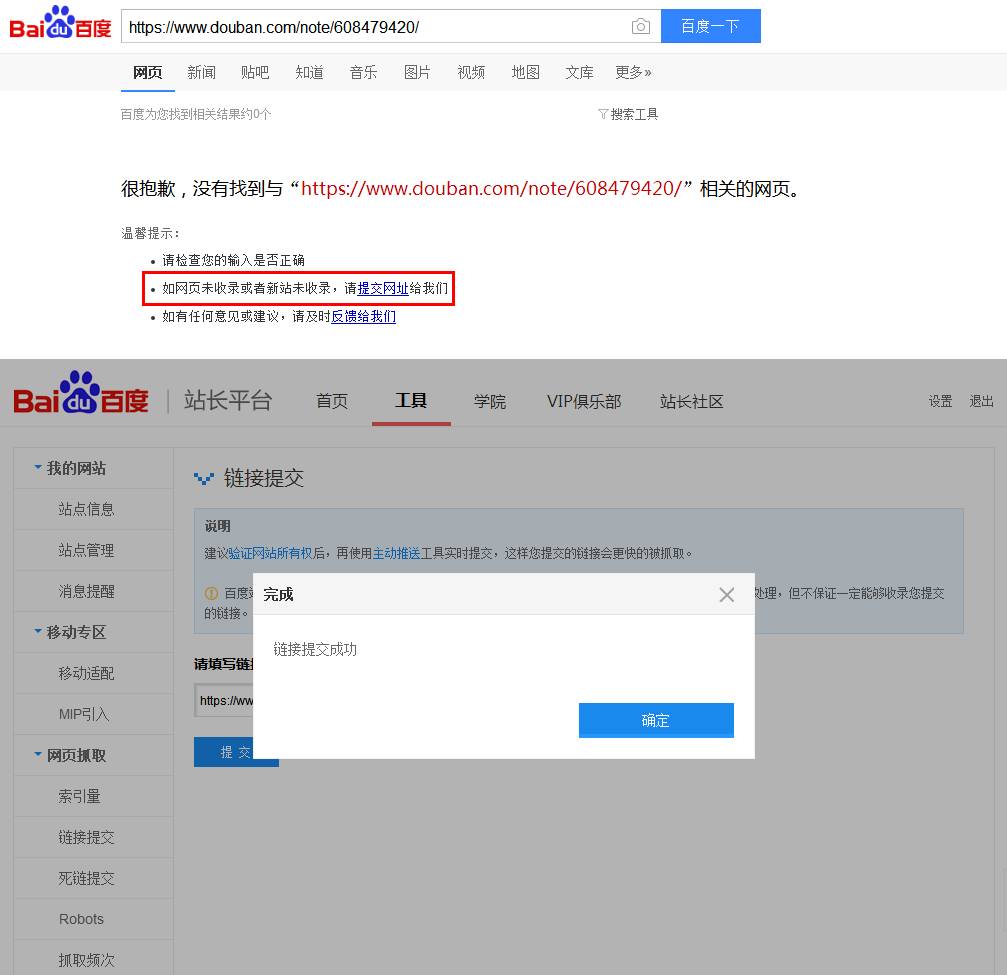 关键四、收录当豆瓣日记成功发布了以后,我们是希望搜索引擎能尽快收录,这样用户在搜索时就有可能通过点击我们的链接从而添加我们为好友。(如何将网站提交至搜索引擎:把豆瓣日记网址粘贴到百度搜索框,然后按下列图示操作即可)