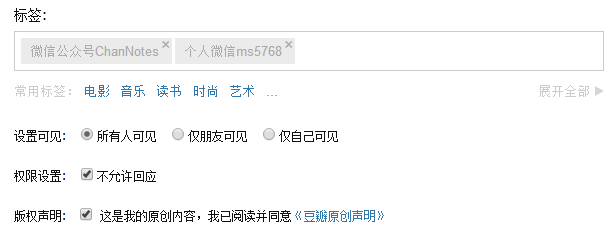 关键二、内容内容的选择上注意软性一些含蓄一些,契合主题以实用性软文为主,尽量规避一些敏感的词语,例如联系方式、**信息等,以免帖子被删或者封号。 关键三、标签在实际操作中标题跟内容是不允许留广告信息,好在豆瓣对标签的界定还是很开放的,自己可以随意编辑标签的内容,我们可以输入微信号、QQ号、联系电话等,实现信息露出这一引流最关键的步骤。