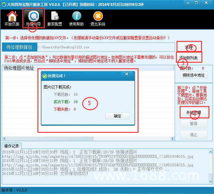 如何可以快速解决这种问题呢? 可以使用大淘营搬家工具直接处理朋友给的数据包。打开大淘营搬家工具处理向导,把数据包csv文件添加进工具,点添加列表,等待地址列出后,点开始处理。数据包全部处理成功,即可导入淘宝助理上传。如图: