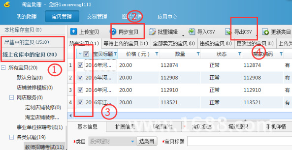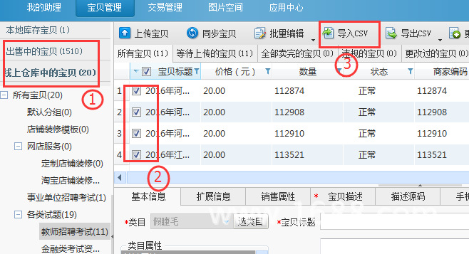 3、打开淘宝助理**中的宝贝,勾选原来导出的宝贝,然后点导入CSV文件,把用搬家工具处理过的csv文件导入。