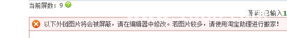 这样在上架宝贝的时候特别方便,可是在上架宝贝保存时,就遇到一个问题, 如图: 以下外链图片将会被屏蔽,请在编辑器中修改。若图片较多,请使用淘宝助理进行搬家!