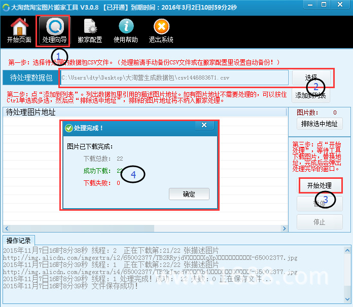 二、有数据包的情况下。 代理了别人的产品,供应商给的数据包不带描述图片,上传不了。运行大淘营图片搬家工具,点开处理向导,选择要处理的数据包,点添加列表,然后开始处理。如图:
