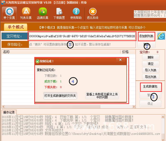 然后按照工具的使用帮助,复制自己要的宝贝描述的宝贝链接,粘贴到工具采集地址栏,点添加列表,然后点生成数据包。如图: