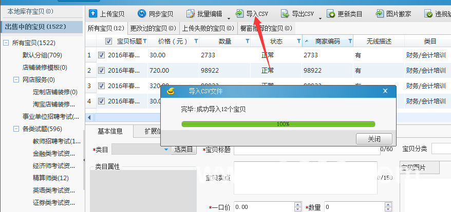 四、打开淘宝助理**中的宝贝,勾选原来导出的那么宝贝,然后把用搬家工具处理过的csv文件导入。