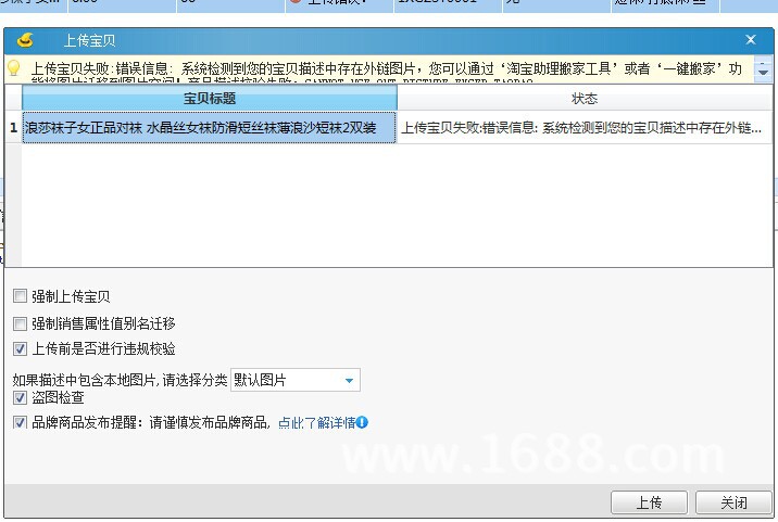 当上述情况的宝贝上传时或修改时会提示:上传宝贝失败错误信息: 系统检测到您的宝贝描述中存在外链图片,您可以通过‘淘宝助理搬家工具’或者‘一键搬家’功能将图片迁移到图片空间!商品描述校验失败:CANNOT_USE_OUT_PICTURE_EXCEP_TAOBAO(如图)