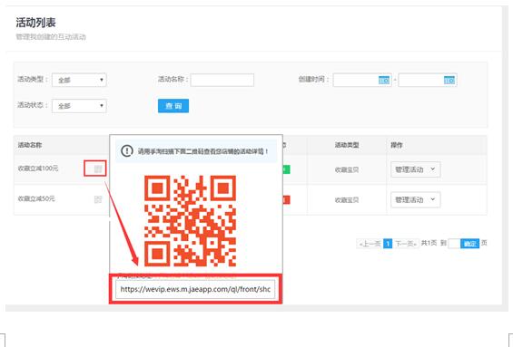 保存设置以后我们的活动就设置完成,然后我们在活动列表你可以找得到我们刚刚设置好的宝贝。并且可以得到活动的推广链接和二维码。见图5