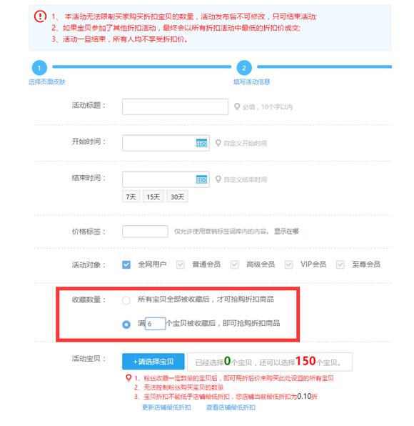 然后我们就得到图4的页面,在红框的位置标有活动内容,有两个选项,一个是“所有宝贝全部收藏后,可以**折扣宝贝”第二个是“满_____个宝贝收藏后可以**折扣商品”。到这一步大家就明白了吧,我们就是通过买家收藏宝贝以后给买家一定的商品折扣促使买家下单购买,即可以增加我们店铺宝贝增加收藏,也可以促使买家购买折扣宝贝,提高转化。明白原理以后,我们选第二个选项,然后设置收藏宝贝数量,宝贝数量虽然是越多越好,但是我们也不能让消费者感到繁琐,所以一般设置4-6个就可以了,再把前面的标题、时间、标签什么的设置好。然后我们选择需要顾客收藏的宝贝