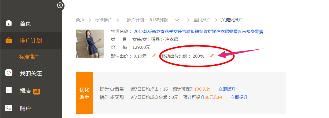 (7)如果第二天晚上20-24点,排名没有上涨就需要抬高一下出价,点击要保持一个增量,比第一天多一倍或者不到一点,30%以上的收藏加购占比,最终点击率要拖回到1.5倍以下。