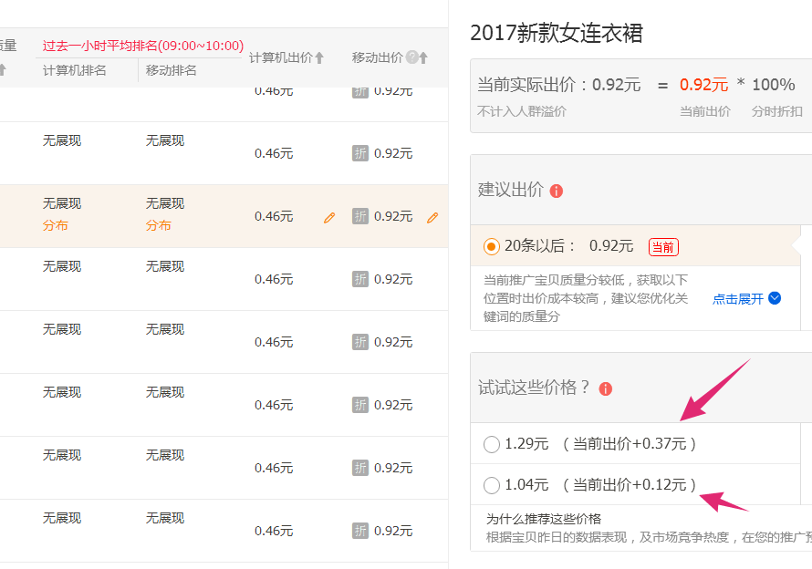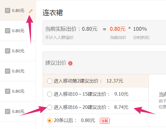 (4)有展现的马上做几次快速点击率,第一次做完之后改价格,做第2次的时候也要去看数据。一直做到排名到16-20名左右。