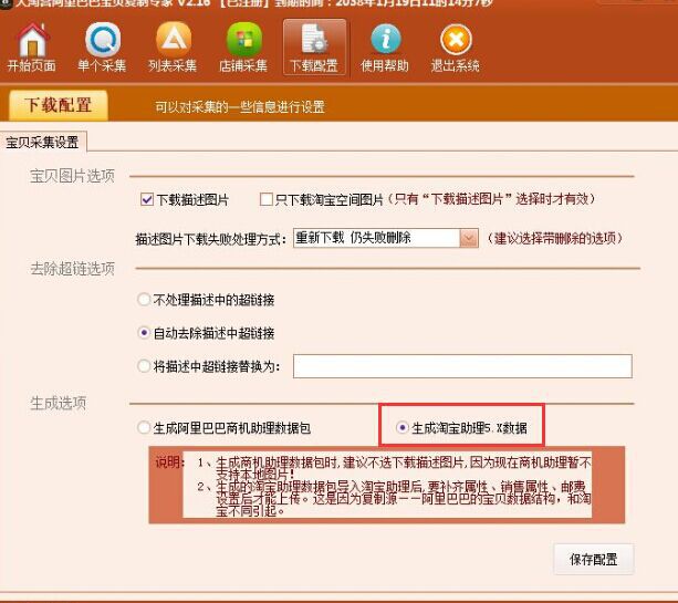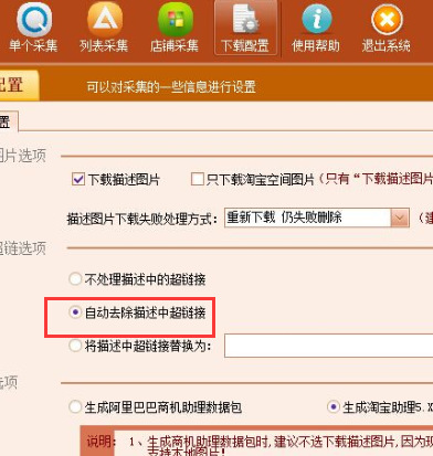 3可是在用大淘营阿里巴巴宝贝复制专家,复制宝贝,导入淘宝助理,上传时,遇到提示“html源码含有非法链”这个问题,怎么办? 这个问题很好解决的只需要在复制的时候,在下载配置里勾选“自动去除描述中的超链接”就可以了