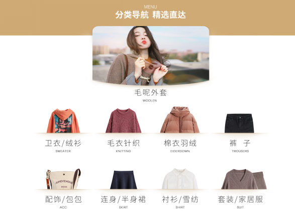 3、宝贝推荐及专区分类 把你的店铺里卖得最好最受欢迎的宝贝罗列出来。如果店里有几种明显区分的二级类目,例如连衣裙、毛衣这些,可以在宝贝推荐后面分区,每个种类用一幅漂亮的海报做铺垫,下面放三四款单品。如果没有条件做那么多海报,像以下例子这样简洁清晰的分区也是可以的:
