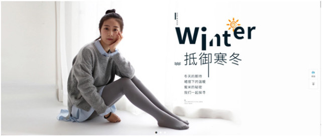 这张海报,除了一个模特之外,边上的文字是纯装饰用的,没有任何信息可以知道这是在卖什么,是衣服还是袜裤?且文字的颜色过于浅,在浅色背景上看起来显得吃力,所以这是不可取的。 其次首页下面直接接了产品的排版