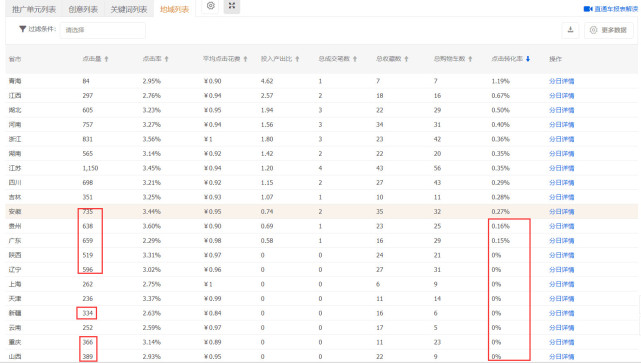 先来看投放地域。打开直通车的地域报表(下图),我们来分析一下是哪些地域拉低了转化率。