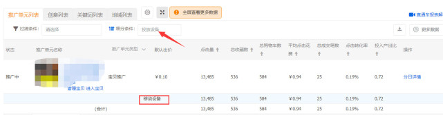 这个计划投放设备只投放了移动端,所以就不用分析了。如果同时投放了PC和移动而PC转化更低的话,可以暂时把PC停掉。