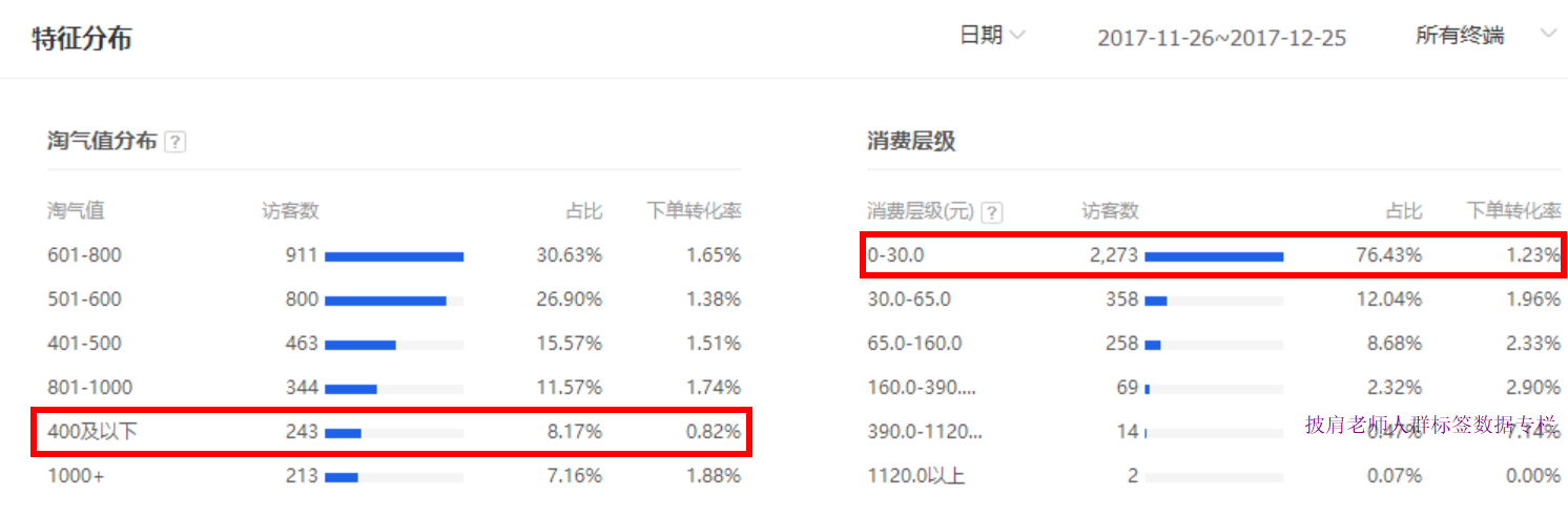 以上数据是从生意参谋-流量-访客分析-访客分布这里截图的,大家可以进入你的生意参谋后台去看看你的数据是怎样的哦,我们先来截图一下这个店铺的数据,首先转化最低的0-30元的消费层级占据76%,是非常多的,而这个店铺的客单价是70元左右,这样的结果就是你的店铺大部分进来的访客,购买力是比较低的访客,他们平常在类似类目里比较喜欢的30元以下的产品,而你的卖70元,转化低就必然了。 所以作为这样的店铺,必须想办法减少0-30元的消费层级,和减少同样转化低的400元以下的淘气值(新手买家,月均消费300元以下)。