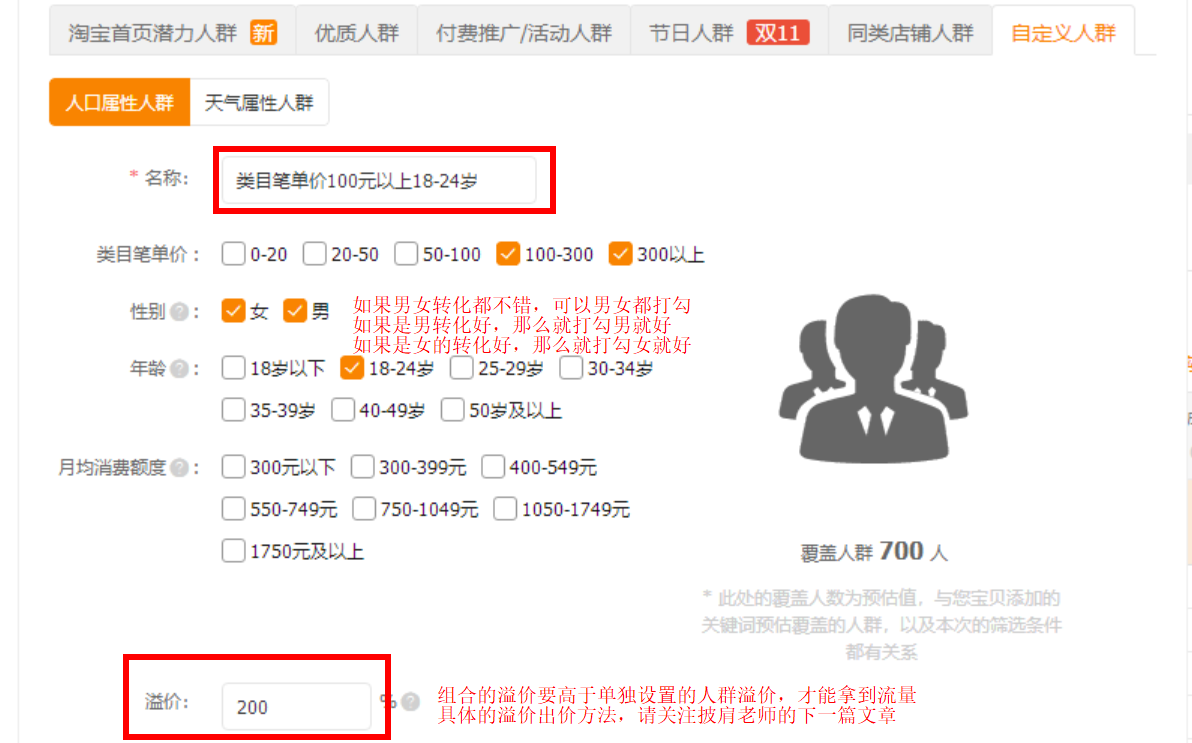 比如说上图作为一个已经有不错访客的老店,会有这样的数据告诉你,你的店铺是属于青年之家还是中年之家,青年之家一般是18-25岁和26-30岁,中年之家是31-35岁,36-40岁和41-50岁,系统会根据哪个年龄段的数据多一些就告诉你青年还是中年,但是我们实际在参考年龄的时候,还需要根据支付新买家的占比情况来定,比如这个店铺,占比多的是18-25岁,26-30岁,31-35岁,所以在引流的时候,就需要主要的去引这三个年龄段的访客,因为你的产品,这三个年龄段的比较喜欢。 但是,因为你不确定这些年龄层级的访客里面,是不是有低于你的定价的消费层级存在,所以年龄最好不要单独设置,而应该和消费层级一起组合。比如,你的定价是100元,那么在组合的时候,你就需要把100元以上的和年龄层级组合,既保证了转化,又可以避免低消费层级的访客进来,扰乱了你店铺的人群结构。组合方式看下图:-