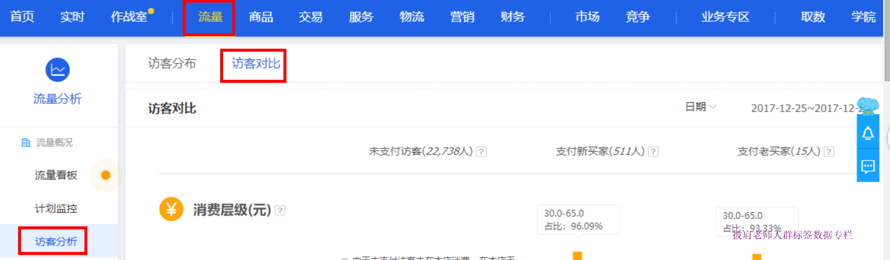 生意参谋后台的消费层级,在直通车的精选人群里面对应的就是类目笔单价,淘气值对应的是月均消费额度,那么作为新手掌柜,你的生意参谋后台可能还没有数据告诉你你的店铺什么消费层级和什么淘气值转化好,但是不用担心,一般而言,你的产品定价是多少,消费层级就会高于你的定价的转化好一些,比如你的产品定价在100元左右,那么你要主引的就是100元以上的类目笔单价,这样引进来的客户就是能接受你的产品价格的,转化自然就会好一些,所以如果你的产品定价是100元左右,你应该设置的人群就是类目笔单价可以分开设置的,100-300,300以上两个人群。 淘气值也是一样的,一般而言淘气值越高的,转化会越好,所以作为新品为了转化保守起见,转化一定好的淘气值是801-1000,1000+以上,这两个淘气值对应的月均消费额度一般是1050-1749元,1750元以上两个,所以这两个是可以单独设置的。 然后是年龄层级,这个数据在哪里看呢?还是生意参谋-流量-访客分析-访客对比里面,看下图:-