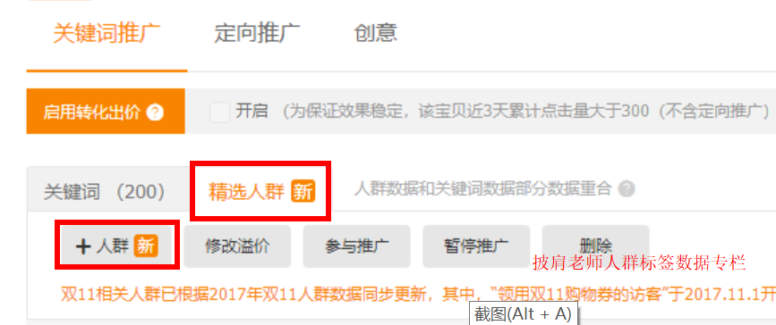 但是可能有新手掌柜要问了,我的是新店,没有这样的数据,怎么办呢?其实和老店铺的操作方法是差不多的,只能会有些不同,比如你的消费层级还是白纸一张,没有出现这样访客结构单一而且转化最低的访客占比大部分的情况,所以在人群这一块你少了调整的过程,但是需要去培养正确的人群,以防出现上图这样的情况,那么怎么培养呢?你需要主动去引精准的人群,比如你的店铺假如是100元左右的客单价,你就需要去引100元以上的人群,100元以上的访客多了,影响到系统的判断,系统就会在自然流量这一块,也主要给你引进100元以上的免费流量,那么你的访客消费层级的结构,就良性了。 大家都知道,免费流量这一块我们是没办法决定人群的,我们能自主决定人群的就只有直通车的精选人群,是最快也能直达的方法,新手卖家可能会担心,我的是新店呀,开直通车效果会好吗?其实,只要你的人群引对了,转化是不同担心的,或许新店客户沉淀少不能让你当天就转化很好,但是至少7天内,30天内,不会很差的,那么新手掌柜怎么主动设置精准人群呢?我们看下图:-