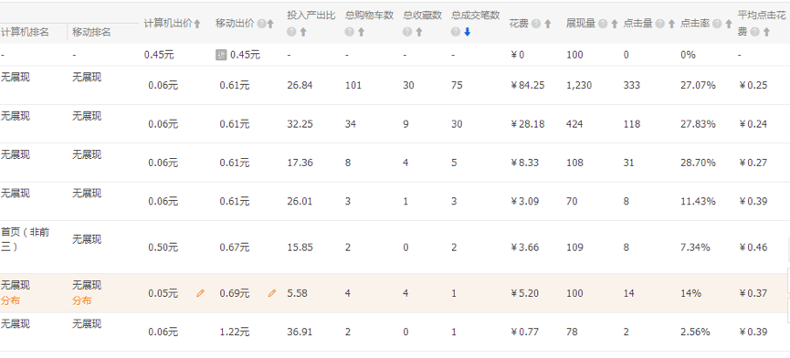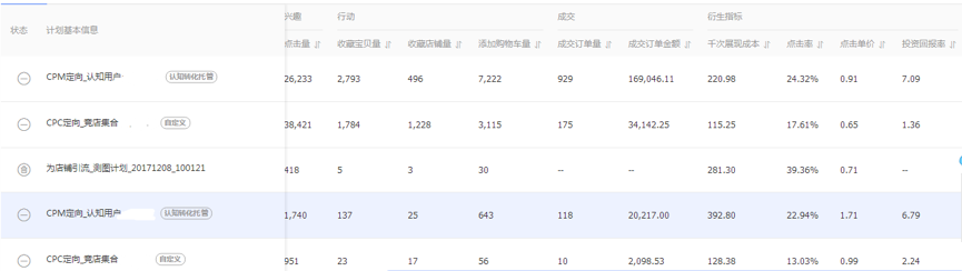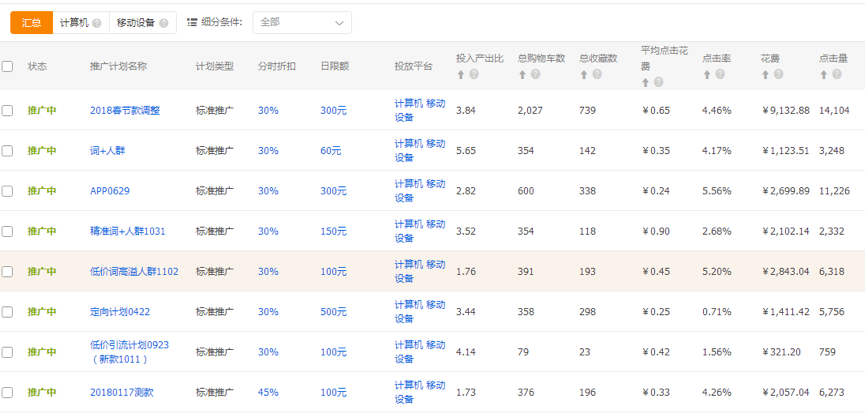 看了上面的数据,我们会发现,在平销中,不同的类目,产品,操作的方法非常多. 并且平销在日常运营中,包括了产品定位,规划,店铺引流装修,标题优化,付费推广引流等,内容非常多. 我们今天就重点分享一下关于引流推广的内容.并且在推广过程中,我们的客单价不同,利润比率不同,在推广过程中选择的渠道也会有区别,比如上述两个案例中,第一个由于客单价低,相对利润比较薄弱,广告费用预算少,所以平销就只选择了直通车进行推广.第二个由于客单价高,相对转化周期会较长,广告预算相对较充裕,因此选择了直通车和钻展相结合的策略. 那我们接下来首先重点分享一下在平销中直通车的推广技巧. 1. 计划规划 1.1测款计划. 平销需要做好,首先一定要找到更多的款式和流量入口,因此我们需要把直通车的计划都利用起来.我们的后台最低有8个计划.最高的有20个计划,很多掌柜只用了一个计划.或者是一个产品一个计划.这样相对来说都是属于比较浪费,我们尽量把现有的计划都利用上.首先需要有一个测款计划,可以把全店宝贝都放到测款计划里面,因为平销想要做好首先需要有好的款做支撑给店铺带来更大的流量和转化.所以在测款计划里面找到那些高点率的款和图片.这样才有利于我们优化后面的计划.(测款计划加入全店宝贝/价格可以出到市场平**格的50%左右.关键词加满200个,开始不加人群,先用广泛流量测试) 1.2低价引流计划 通过测款计划找出来的款,我们可以再另外单独细分,建立一个低价引流计划.低价引流计划就是我们用高点击率的款和创意图片,然后加满200个关键词,关键词出价出到市场平**的30%左右.如果没有流量可以再往上以10%的速度递增,直到有流量为止.这种非常适合服饰女装类目.词多广撒网可以拿到不错的流量 1.3精准计划 在很多标品类目不太适合低价计划,因为很多标品类目词少,竞争激烈,价格出得太低往往连展现都拿不到,需要我们再做细分的操作,找到高点击率的款和图之后,我们可以再放到不同的计划做不同的渠道引流推广,比如可以细分为无线精准词计划,PC精准词计划. 1.4定向计划 定向计划很容易被大家忽略,但实际上定向计划的效果现在非常理想,尤其是有手淘猜你喜欢的这个位置的投放.如果我们的产品和图的点击率够高,在定向这一块可以拿到非常低价而且投产非常高的效果.并且定向计划建立大家单独做,同样的可以把要卖的宝贝都加进去,智能投放的价格可以出低一些,从而达到全店引流的目的.