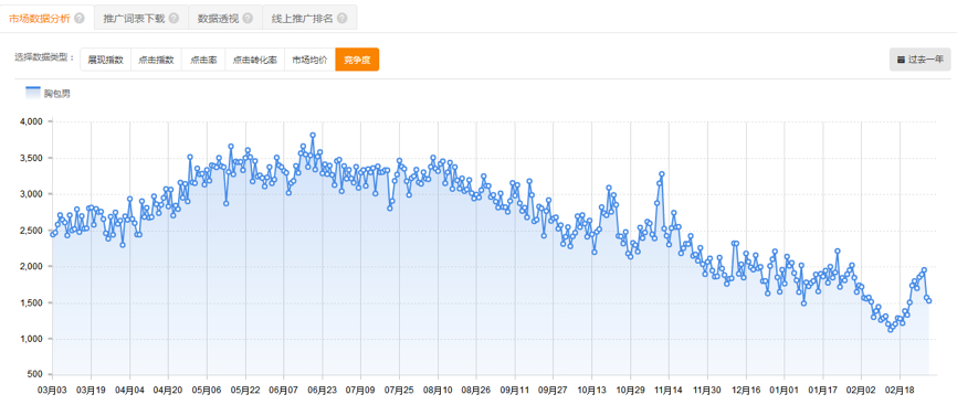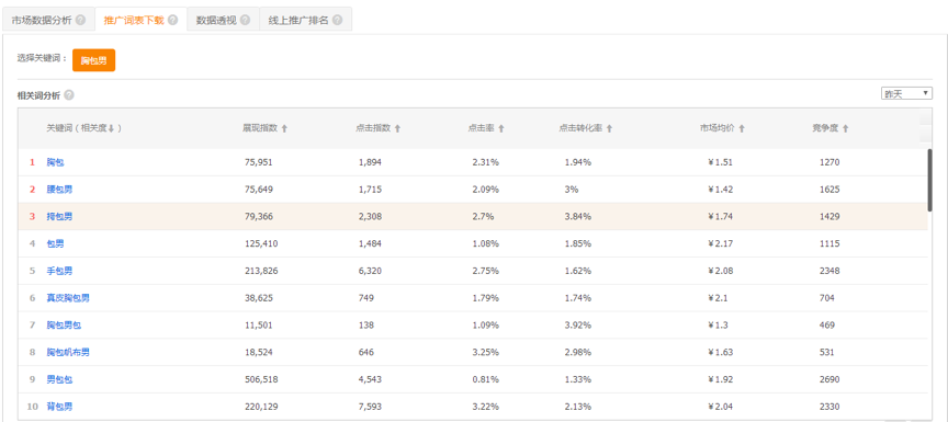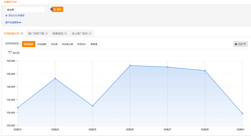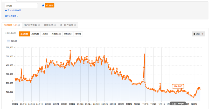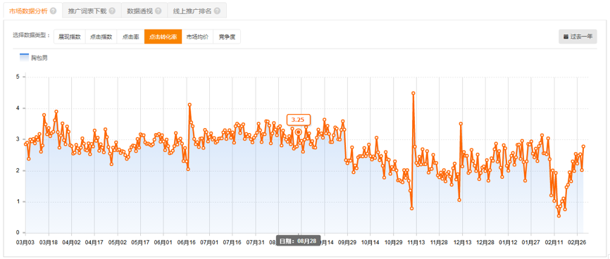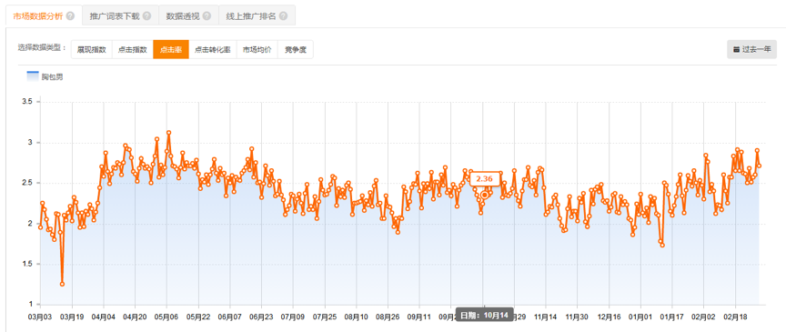 1.1.展现指数 首先我们可以通过展现指数看到过去一年的这个词的数据,胸包男这个关键词从3月份展现指数开始上涨,六七月份为高峰期,然后到10月份开始下滑,这代表了买家的搜索热度甚至需求度的一个时间段.还可以通过这个数据来判断我们店铺接下来需要重点主推的产品. 1.2.点击指数 同样以胸包男这个关键词,我们可以看到点击指数的曲线走势与我们的展现指数是差不多的.可以把他参考为他的流量趋势. 1.3.点击率 我们再用同样的词来看点击率的数据,可以了解到点击率平均在2.5%左右,有了这个数据,我们在平常的操作过程中就会心中有数了.因为经常会有掌柜问到:我们的关键词点击率到底能达到多少才是合格的?那么看了上面的数据就应该知道了,你至少要达到甚至高于市场的平均点击率吧. 1.4.点击转化率.
