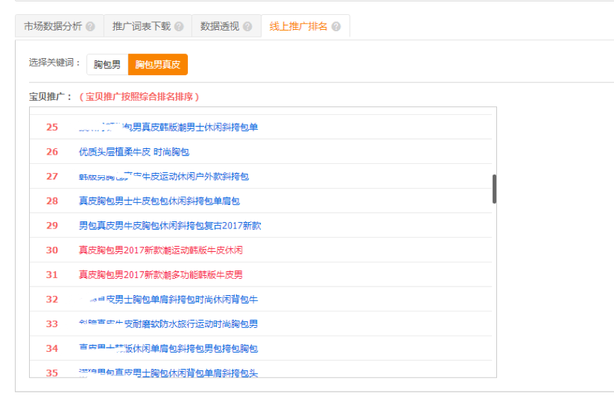 4.线上推广排名 线上推广排名的顺序是按照综合排名顺序来排序的,我们可以把他做为我们在推广过程中的一个排名参考.标红的是表示自己的产品所排在的位置.由于现在受千人千面的影响,这个排名我们可以稍做参考就行.