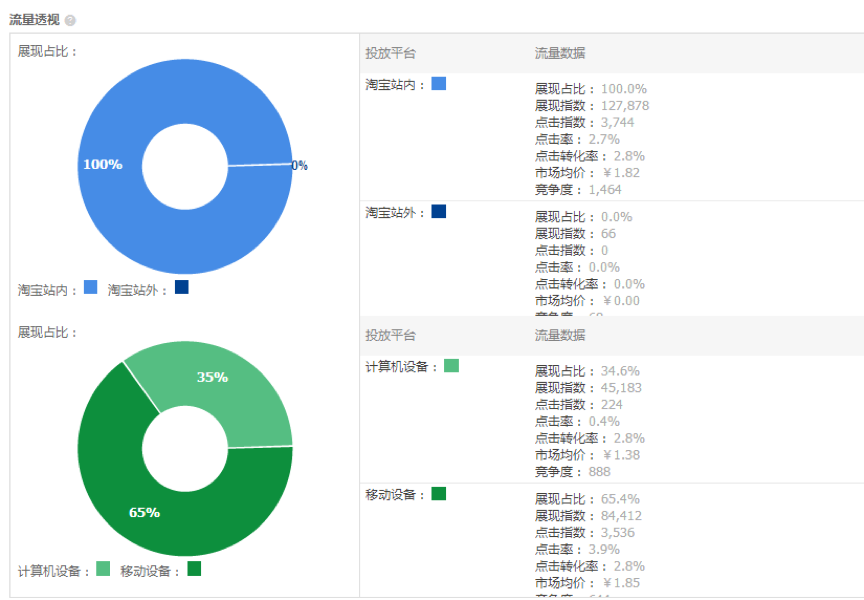 点击转化率的数据很重要!因为经常会有掌柜说推了半天没有转化,那么有没有分析过关键词本身的转化率是多少?这个也是可以通过我们的流量解析工具了解.所以当发现一个关键词花钱特别多但是没有转化的时候,首先就要看一下这个词本身在市场里面有没有转化?再去检查自己的产品与内功的问题. 1.5.市场**和竞争度. 很多时候我们关键词出价的时候需要参考一下市场**,不同的类目也会有不同的出价模式,在标品类目竞争关键词少的类目里面,如果关键词出价过低会拿不到流量,至少要高于市场**或者达到市场**才可以.但在非标品比如服饰类目里面,在测好款和图的情况下,有可能我们只需要出到30%-40%就能拿到流量了.另外就是竞争度了,竞争度小的关键词出价低也能拿到流量.竞争度大的词就需要出价高点.因此这个数据我们也是可以参考判断的.