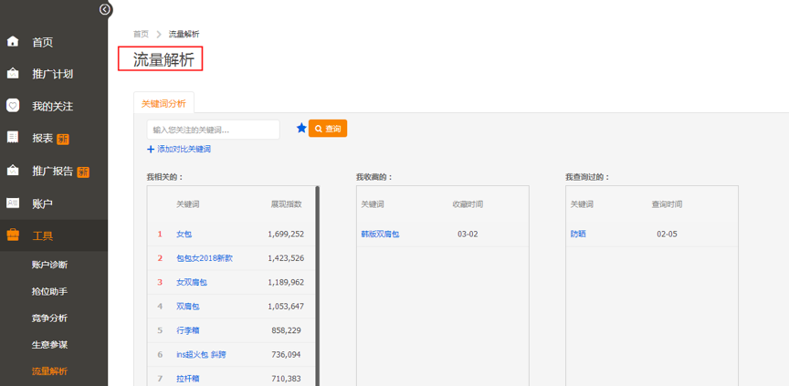 首先在直通车后台-工具-流量解析,进入之后就会出现上面的界面-关键词分析(也可同时添加多个关键词进行数据分析和对比) 接下来我们就可以针对我们平时推广中的关键词或者通过各种流量渠道筛选出来的关键词进行分析和预测.首先是关键词的市场数据分析. 例如:胸包男/在关键词分析界面输入我们想要查询的关键词胸包男.那么就能看到这个词最近七天的展现指数/点击指数/点击率/点击转化率/市场**/竞争度.系统默认的是七天的数据.