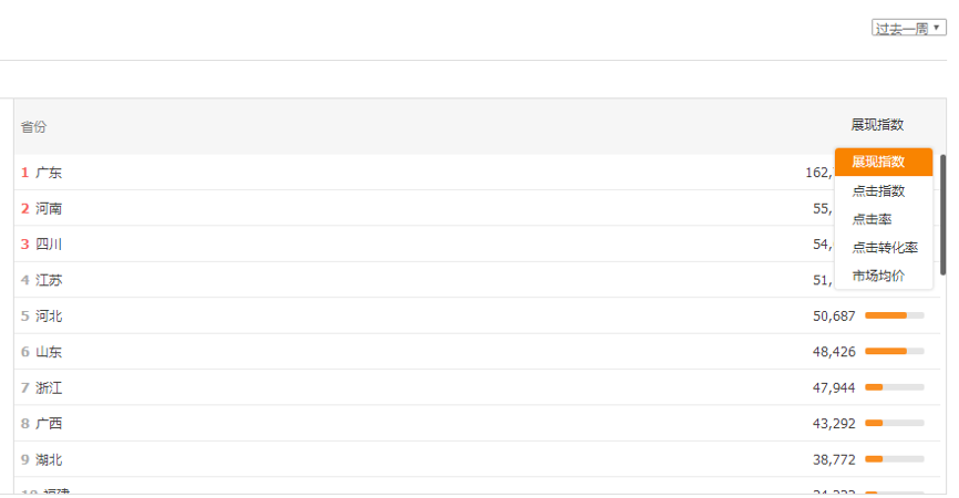 3.数据** 3.1.地域** 地域**里可以看到该关键词的地域数据,在地域数据里面,我们可以选择过去一周地域的展现指数/点击指数/点击率/点击转化率/市场**等等数据.我们可以通过关键词地域的数据来对账户进行优化.比如在需要提升点击率的计划里面,我们可以重点选择展现指数相对比较大而点击率也高的地域进行投放.需要重点提升点击转化率的计划,我们可以从点击转化率的数据来做参考.