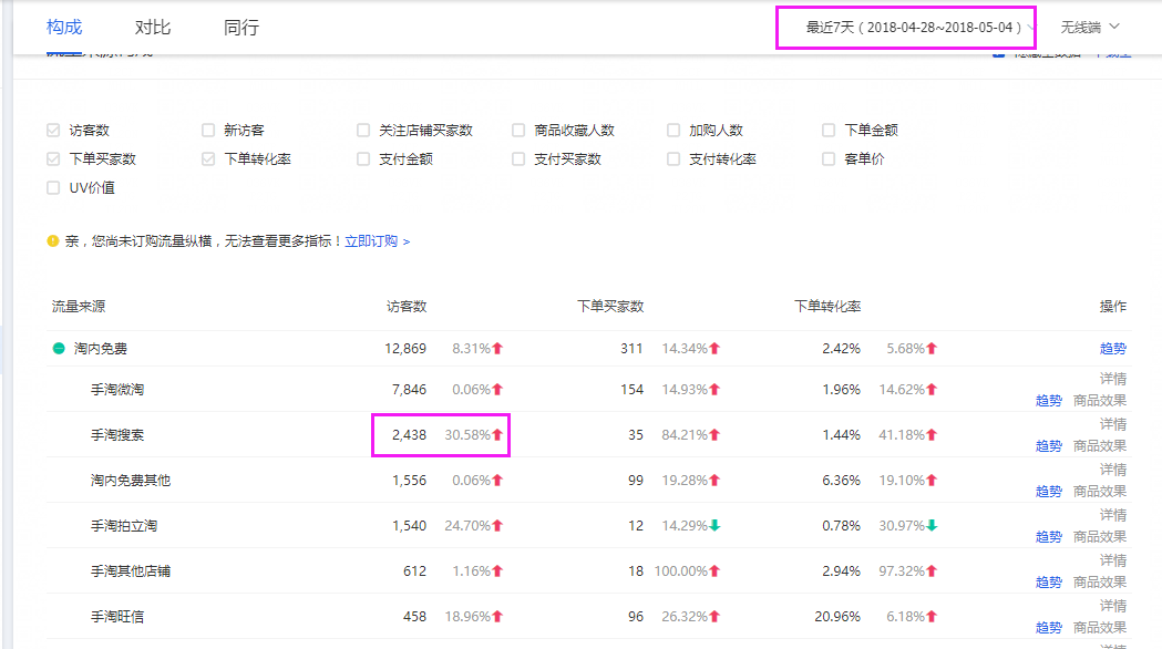 从生意参谋的市场行情可以看出,大码女装这个类目在整个淘宝平台中的访客数为7位数。 ) 从以上2张图中可以看出连衣裙和T恤类目的访客数均为8位数,而整个大码女装的访客数为7位数,这其中的差距不用我说了吧。这个大码女装店铺的宝贝恰恰都发布在了大码女装的类目下。有的掌柜可能会说大码女装发布在大码女装类目下定位不是更精准吗?这是一种巨大的浪费。 大码女装这个类目非常小,换句话说,一个丰满的人去淘宝买衣服,难道一定会搜索带“大码”字样的词吗?我想答案肯定是不一定的。有的掌柜为了不参加“七天无理由退换”而将产品全部发布到大码女装类目下的行为无异于捡了芝麻,丢了西瓜。 我把这个道理跟掌柜交流过后,掌柜愿意试一下后面新品发布到其他对应类目。至于效果还是看近7天的销售额占比数据吧! ) 这是近7天流量结构变化的数据,自然搜索的流量小涨了一些。