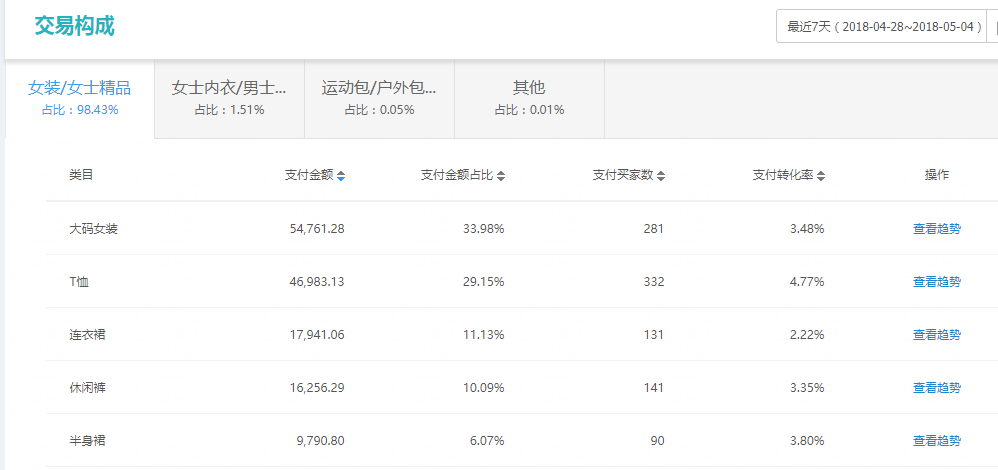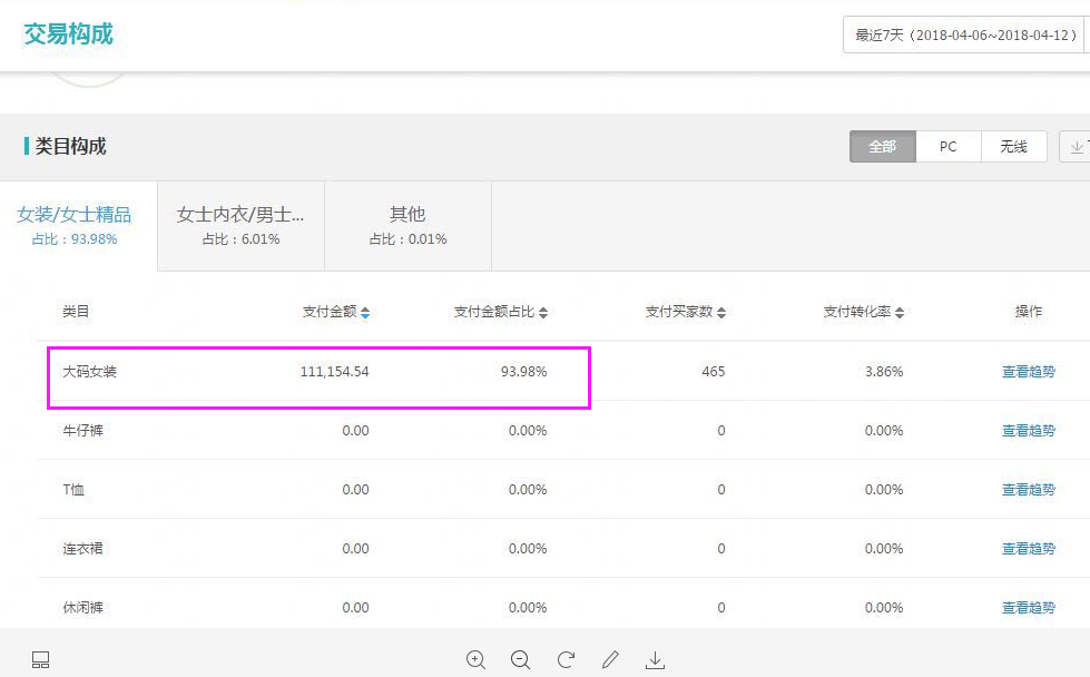 大码女装类目的金额占比高达93.98%,可见掌柜把店铺99%的宝贝都发布在大码女装类目下了。