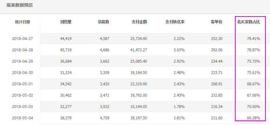 大码女装就是针对体重超过标准身体重量的丰满女性朋友而量身定做的服装。大码女装的商品特性就是体型较胖的人穿,穿上去不仅要显瘦还要且自然、好看。 我接手的这个大码女装的流量特点跟我运营的其他类目很不一样,大家先看几张图片: 从上面两张图不难看出,这个店铺差不多一半的流量是来自于老客户,每天的支付金额中老客户占比高达70%以上。有人可能会认为老客户维护得真好。其实,这样一个数据占比是非常不正常的。这是一个十年的老店,开店时间比较长,可是自然搜索流量为什么这么少?跟同层级的商家相比,流量差距大,获取新流量的能力为什么这么低?这是一个值得思考的问题。