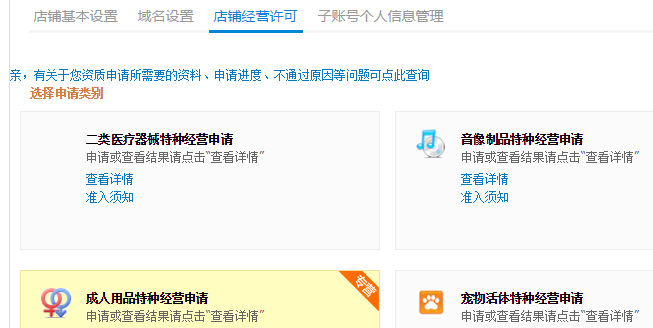 步骤⑥、店铺经营许可:就是类目比较特殊的店铺需要去申请许可证
