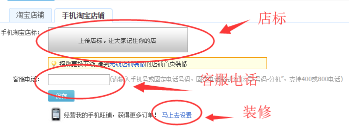 步骤④、无线端设置: 就是无线端的店标和客服电话以及店铺装修,看图吧!