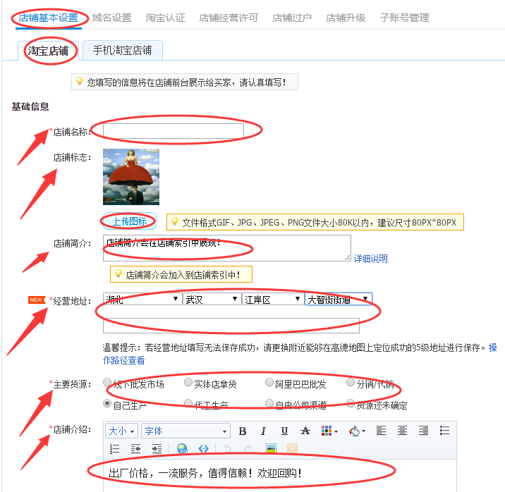 1、“店铺名称”:你的店铺名称看自己啦!比如是卖床上用品,可以取个“一辈(被)子”! 2、“店铺标志”:你的店铺商标,自己去找图吧!图片文件格式GIF、JPG、JPEG、PNG文件大小80K以内,建议尺寸80PX*80PX!要注意啦! 3、“店铺简介”:会加入到店铺索引中!这一部分可被用户搜索,认真填写。 填写①、掌柜签名:店铺的签名或者是店铺的一种展示,也可以说是店铺的口号。 例如:童年的衣柜、买的欢乐卖的快乐。 ②、店铺动态:指的是店铺要发生的促销活动。如:店铺打拆、免运费、有红包等一切促销等。 例如:满2件包邮 六折 ③、主营宝贝:指的是店铺里主要经营哪些宝贝,品牌宝贝,什么样类形的宝贝,什么样风格的宝贝。例如某品牌童装 亲子装 男童装 女童装 T恤 长裤 长袖褂子 ④、格式:【掌柜签名】.../【店铺动态】.../【主营宝贝】.../ 全部不需填写时,把里面的点全部去掉。 例如:【掌柜签名】/【店铺动态】/【主营宝贝】/ 把不需要填写的点去掉。 例如:【掌柜签名】/【店铺动态】/【主营宝贝】亲子装 童裤/ ④、经营地址:写地址就好啦! ⑤、主要货源:线下批发、市场实体店拿货、阿里巴巴批发、分销/代销、自己生产代工生产、自由公司、渠道货源还未确定这8个选项看自己情况选择。 ⑥、店铺介绍:介绍自己店铺的经历、特点、宣传性的介绍内容。 最后记得保存哈!