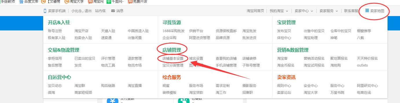互联网在发展,规则在变化,所以我们要跟着潮流前进,不然自己就落伍喽,正所谓不进则退,也许以前的说法现在已经一点用都没有了!自从淘宝的搜索规则改版以后,紧跟着我们店铺的基本设置也发生了变化,看下面吧! 准备工具:电脑一台 步骤①:卖家中心:进入淘宝首页,登陆进入买家中心; 步骤②:店铺基本设置:鼠标放在“卖家地图”上会出来一个列表清单,找到“店铺管理”,下面就是“店铺基本设置”鼠标左键点击进入