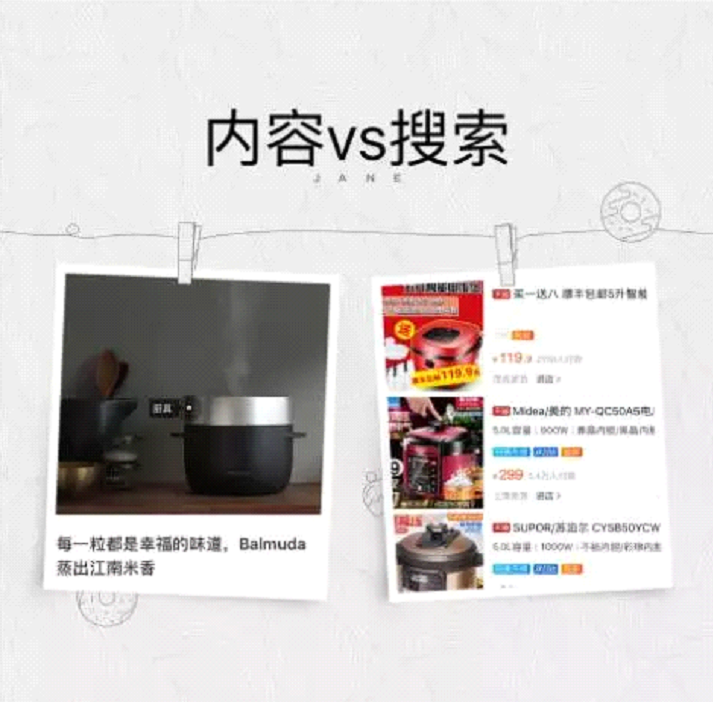 而在内容型电商中,是原本我并没有购买电饭煲的诉求,只是阅读一篇文章后,发现这个文章写出来的电饭煲科技感更强,蒸出来的饭要香,每一粒都是幸福的味道。而我也会与现有的生活环境和生活方式产生对比,发现我家的电饭煲太差了,从而接受他提供给我的信息,达成购买行为,因为这个情节能让我产生共鸣。