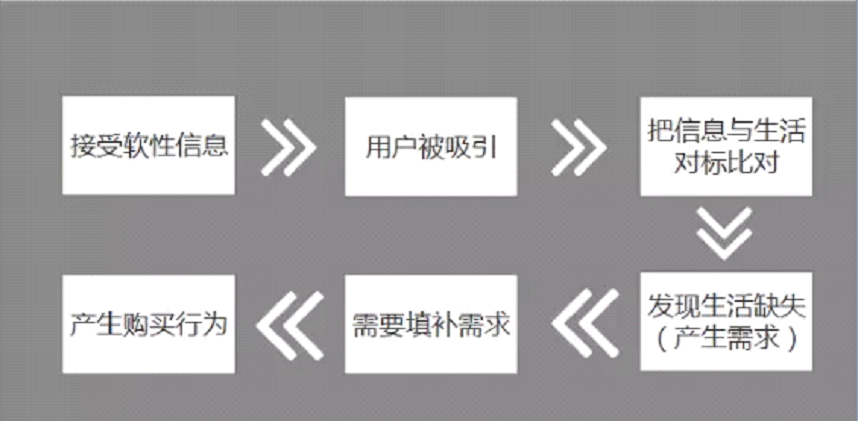 这里我们可以看到,用户是先接受的信息,也就是商家给他营造的购买场景,在这个场景下,用户是被动接受信息,商品的植入也是隐性的,用户对标的是现有的生活环境和自己需求(可能是隐性需求),是被动接受信息的状态。就如同咪蒙的软文,先吸引你的注意,然后告诉你一个事实,你需要这个产品,你的生活才能被改变,生活品质才能被提升,这样的商品信息容易被大众接受。润物细无声,就是这种心理变化曲线。