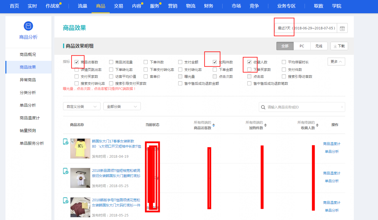 提升动销率有两个方法,一、提升店铺其他宝贝销量。二、删除没销量的宝贝。 但是对于新手店铺来说,本来流量就不多,没有粉丝没有老顾客,那么这种情况下你去提升店铺宝贝销量相对比较困难,所以,接下来带着大家去辨别哪些是可以删掉的,哪些是可以继续**的。首先打开你的卖家中心--点击生意参谋--点击商品--进入商品效果 这个时候记得选择7天,端口选择全部。勾选你的商品访客数、加购件数、收藏人数以及支付买家数,这时候会有商品显示出来。如图2: