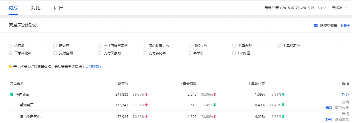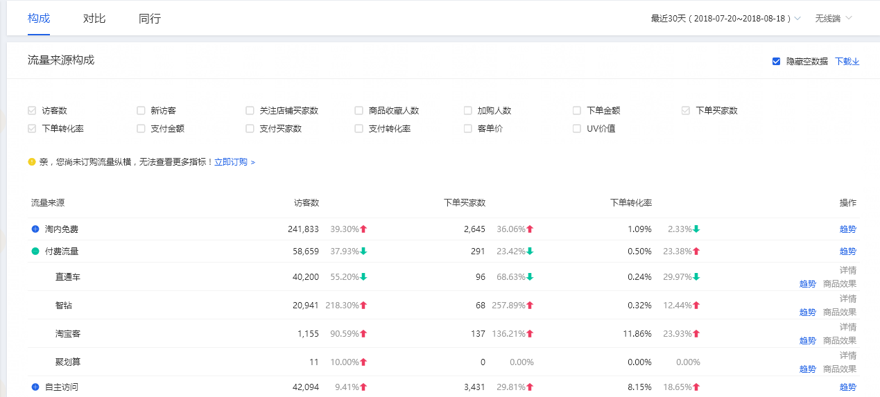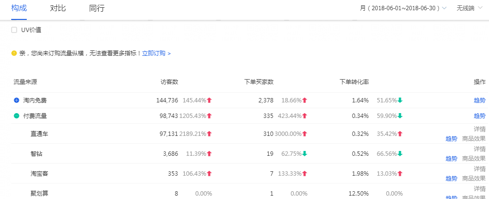 付费占比整体流量的19%、付费流量都以定向推广为核心(钻展单品推广和直通车定向推广)其占比90%以上。