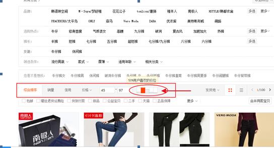 了解购买人群后,我们需要对店铺进行全新的定位,有明确定位的店铺,可以通过数据的分析,看店铺的标签是否朝着我们的正确定位方向走的,如果有偏差,需要调整定位,调整商品以及活动等。尤其是活动方式,最容易导致我们店铺的人群标签混乱。 三、检查商品价格区间。 这里我们要介绍的是,每一个款商品其价格都有相应的价格阶段。也有相应的人群对应,因此我们需要首先检查我们店铺的商品价格阶段是否制定的混乱。例如牛仔裤,当我们搜素牛仔裤的时候,在下方会看到一个价格阶段的显示。