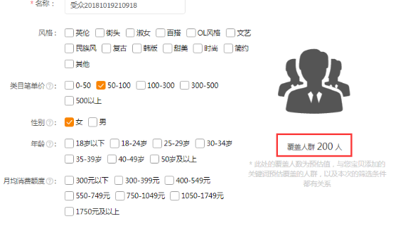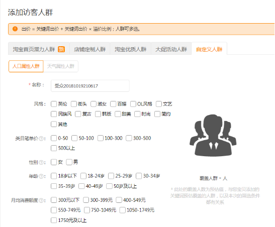 根据需要定位的人群类型,选择风格、类目笔单价、性别、年龄,以及月均消费额度,没勾选一个选项,会出现对应的覆盖人群人数,每个选项都是不一样的覆盖人群数,这里的覆盖人群会受直通车所开关键词引流人群数影响,所以一开始新店铺前期不要一开始就开人群,需要先通过直通车关键词引流,达到一定的引流效果之后,再去操作人群引流。