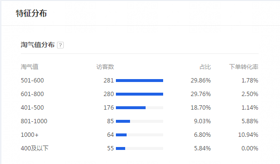以及从生意参谋-流量-访客分析-访客分布,可以了解到人群的淘气值分布数据(如下图所示)淘气值大家应该知道是什么吧,淘气值作为消费力的重要指标,不只看买家的购买力,以及买家购买后的评价,分享,以及诚信度情况,淘气值越高,那么说明买家质量越好。从淘气值分布可以看自己店铺访客数最多的人群对应的淘气值情况,来判断进店人群的购买力和质量。