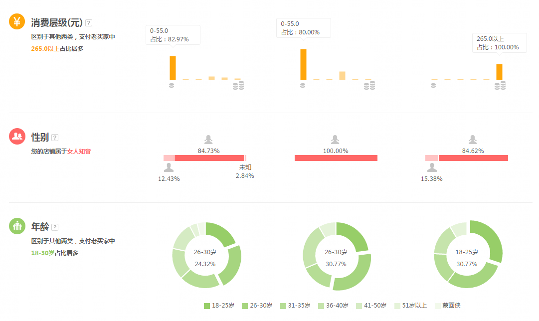 从这些数据可以了解到自己店铺引进来的人群情况,是否和店铺宝贝刚开始的定位是相匹配的,如果消费层级过低,那么就要把店铺稍微高客单价的宝贝进行重点引流,做销量,提高高客单价宝贝的销量,调整消费层级的人群。了解店铺人群定位不仅可以及时调整店铺的问题,后期通过直通车开人群也可以参考店铺的人群数据,以及通过直通车来调整店铺人群,确定精准投放地域,达到更好的效果。