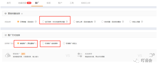 1.测款计划:智能计划和标准计划任选一个即可,一般我们智能推广的话,系统会自动分配流量,但标准推广有更大的操作空间,包括关键词出价、人群优化、点击率的提升,后期可以在此计划上持续操作。无论选择哪个计划,我们需要关注的数据是:点击率是否在行业优秀以上,收藏加购率、转化率等等。