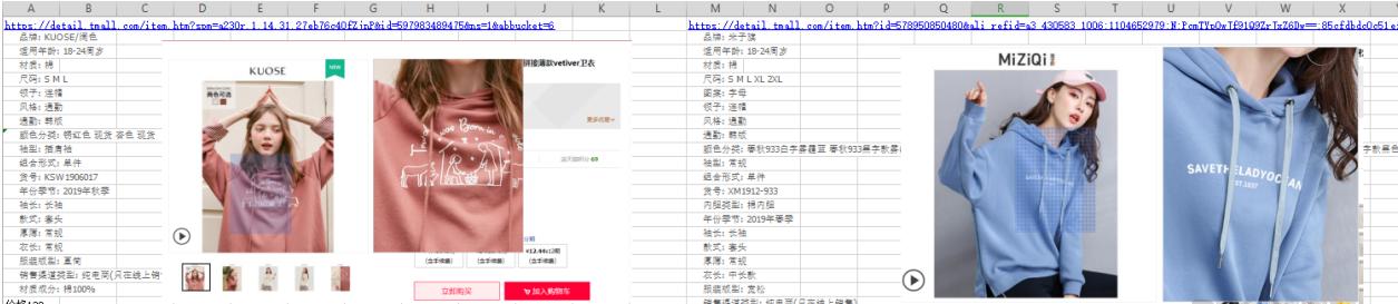 然后对标记过的关键词去淘宝网上搜索,筛选出符合店铺需要的人群标签和产品属性的产品,重点结合产品属性、销量、市场因素去选择,然后把这些款式全部扒拉下来添加在Excel表格里面去比对,如图所示:【注:二十款起,这里节约图文空间只扒拉两个产品】